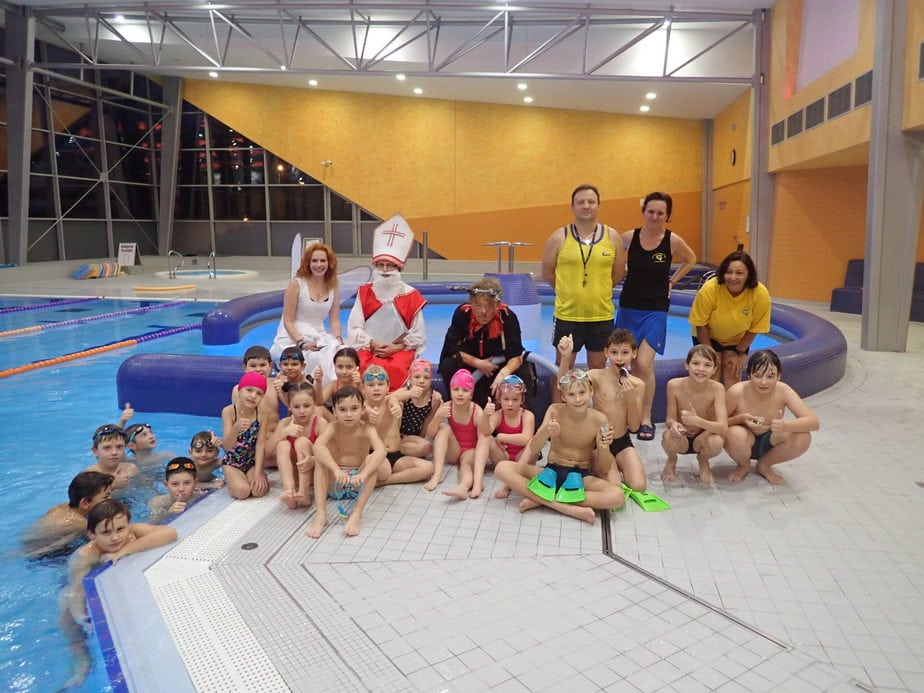Na kontrolu došel čert černý jak uhel a voněl po čokoládě… :-). Laskavý Mikuláš, který se nemýlil ve své knize hříchů, četl… kontroloval a sepisoval si všechny ladně zvládnuté prvky… a obíhal ho nádherný anděl. Sledovali společně poctivě, jak se děti snaží a dělali si poznámky. Radili se, posedávali kolem bazénu a sledovali, jestli se někdo moc neuléval! Po skupinkách si brali děti a řešili s nimi jejich prohřešky… a za nějakou tu snaživou písničko, básničku si dali říct…. pravda, na ty, co snad sprosté slovo občas řekli… se fest zlobili! To viděli všichni… a slyšeli… jak čert práskal do daleka…